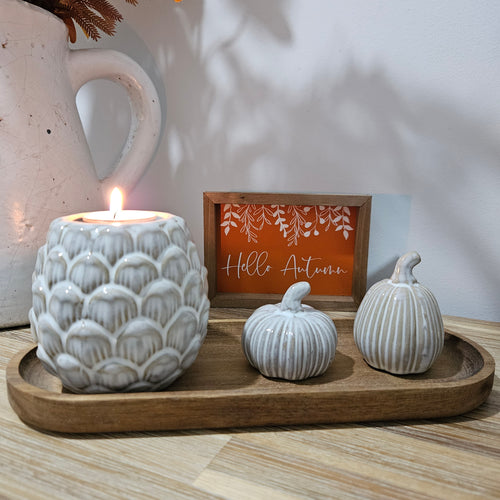 A collection of beautiful autumnal pieces in hues of earthy ambers, warm oranges and golden browns. Infuse your home with the essence of autumn with our collection of wooden, ceramic and velvet pumpkins, acorns pots and dishes, quoted signs, textured blankets and our selection of wooden trays and woven lanterns.