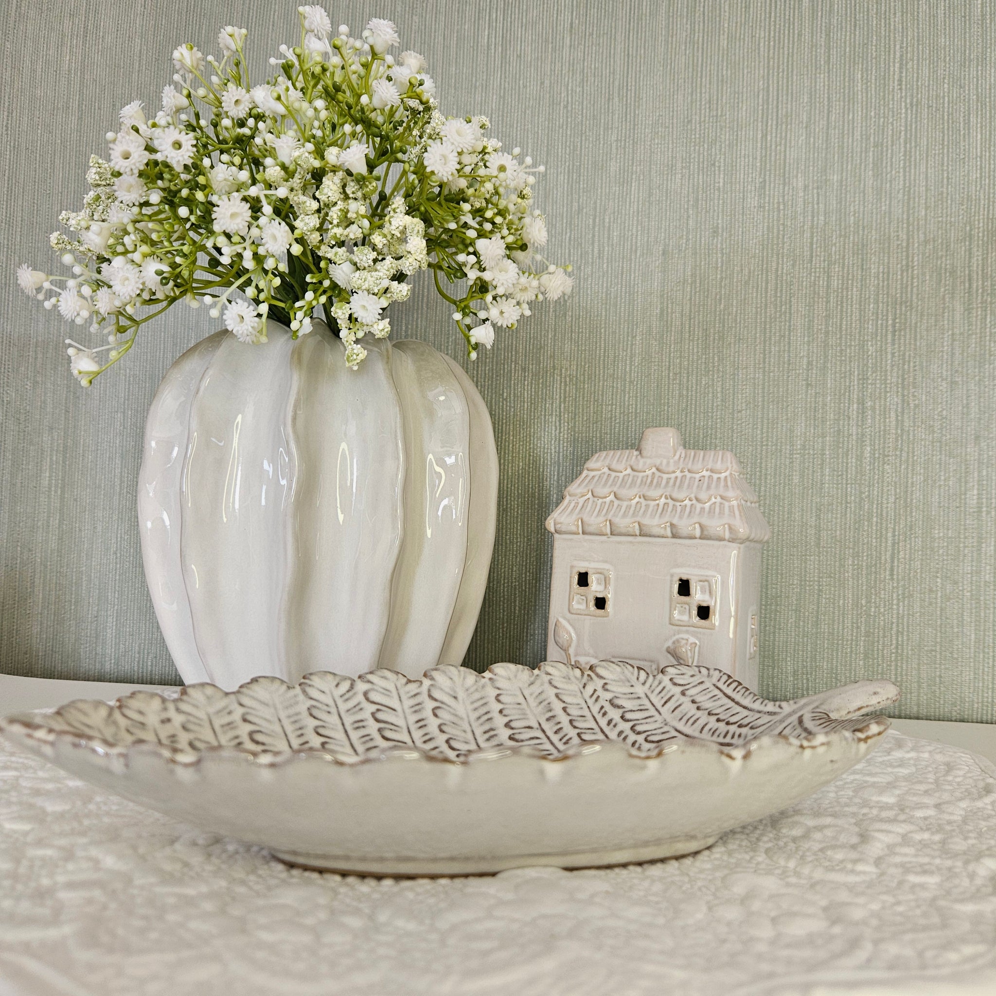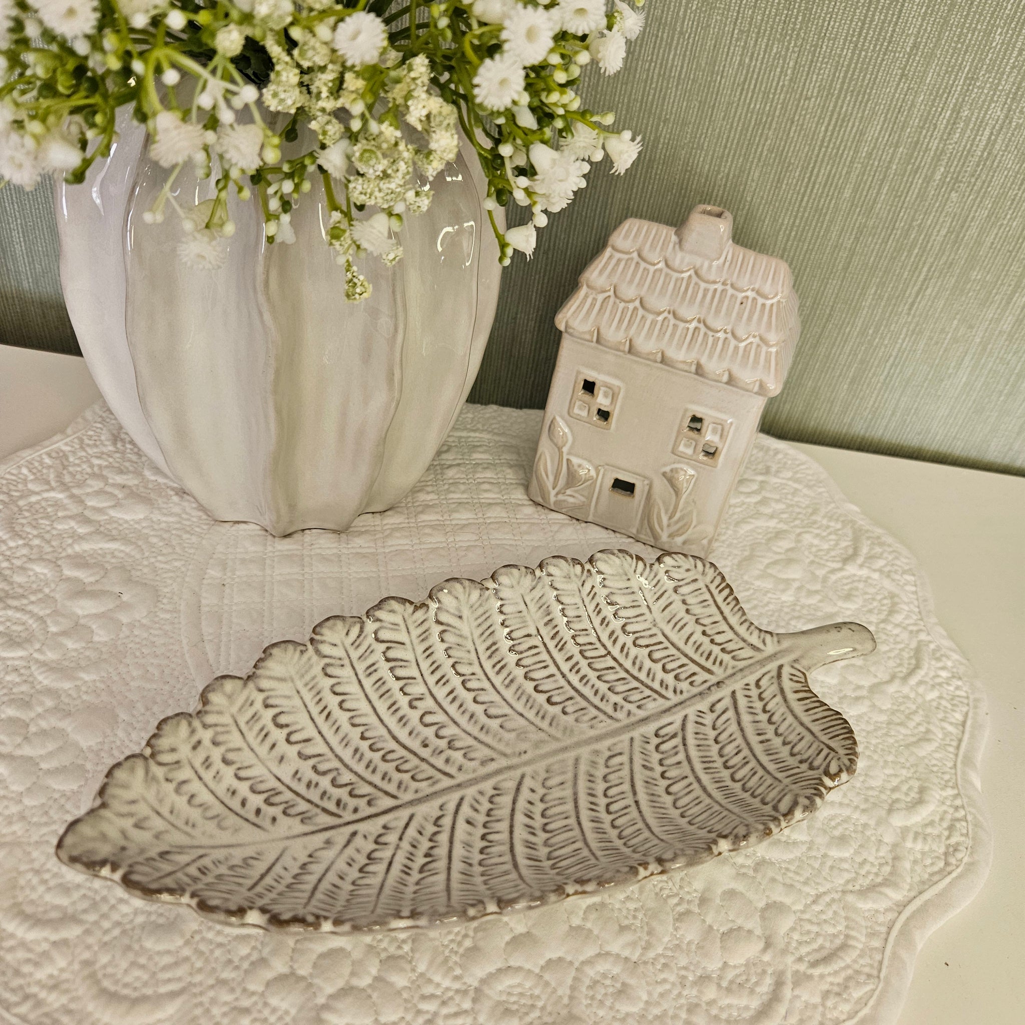 The Lyla Leaf Dish is a beautifully sculpted ceramic piece finished in a soft white glaze with gentle grey undertones. Warm beige highlights accentuate the natural leaf design, creating a stunning ornamental dish perfect for styling shelves, consoles, or coffee tables.