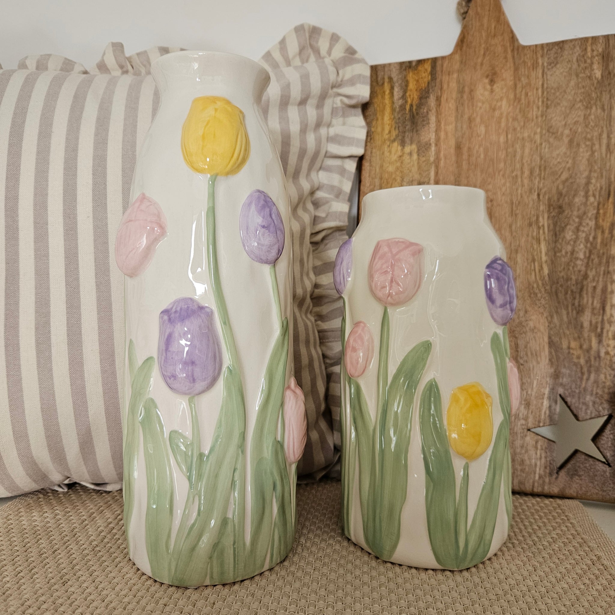 Bring soft spring elegance into your home with these beautifully crafted white glazed tall vases, adorned with pretty embossed tulips in pastel shades of lilac, pink, and yellow. Each tulip is delicately sculpted, paired with complimenting pastel green leaves and stems, creating a serene, romantic aesthetic that brightens any space.